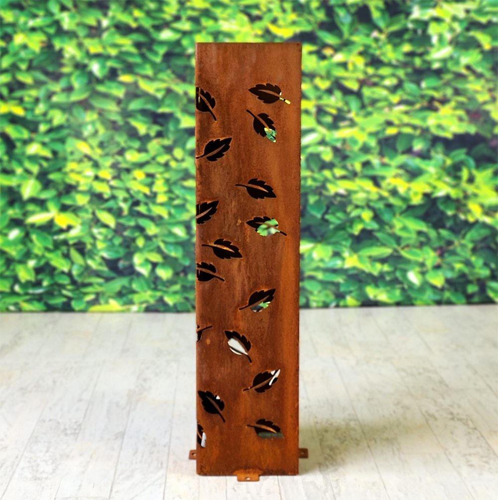 Garden columns are a great way to add visual contrast to your garden, flower bed, or deck. This leaf garden design is cut on all four sides so it looks great from anywhere in your yard. Each column is welded by hand and pre-rusted so it will blend in with your landscape as soon as you place it in your space. They work great as a stand-alone monolith or combine 2 or more for extra texture. They even make great platforms for climbing vines or vegetable gardening where you have a plant that needs something to grow on like tomatoes or beans.