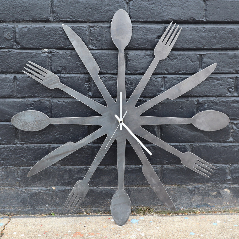 Foodie Metal Clock - Rustic Home Cutlery Wall Art - 24" Diameter with Spoons, Forks, and Knives