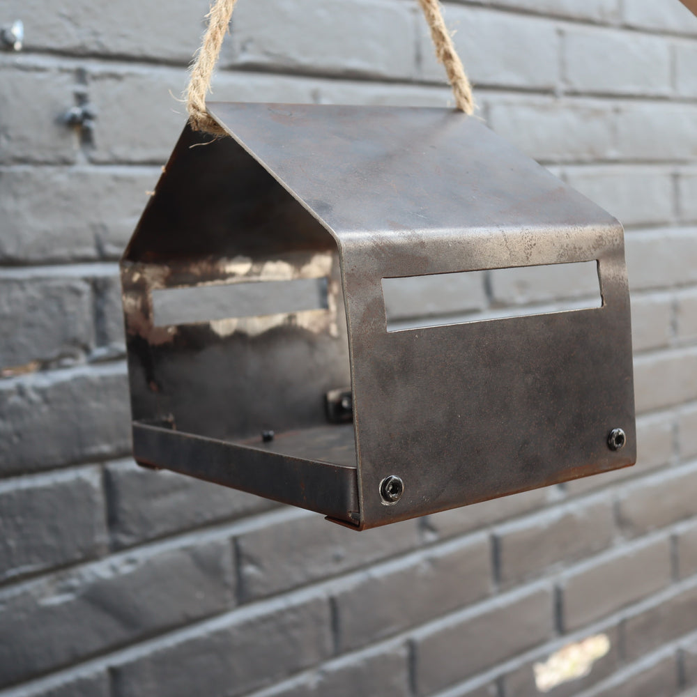 Make a peaceful place for your favorite birds to feed. Enjoy the tranquil company of your local songbirds with this rustic metal bird house, which acts as a great bird feeder! This minimalist design will bring out the beauty of your feathered friends, and provide a non-intrusive perch for them to play on.