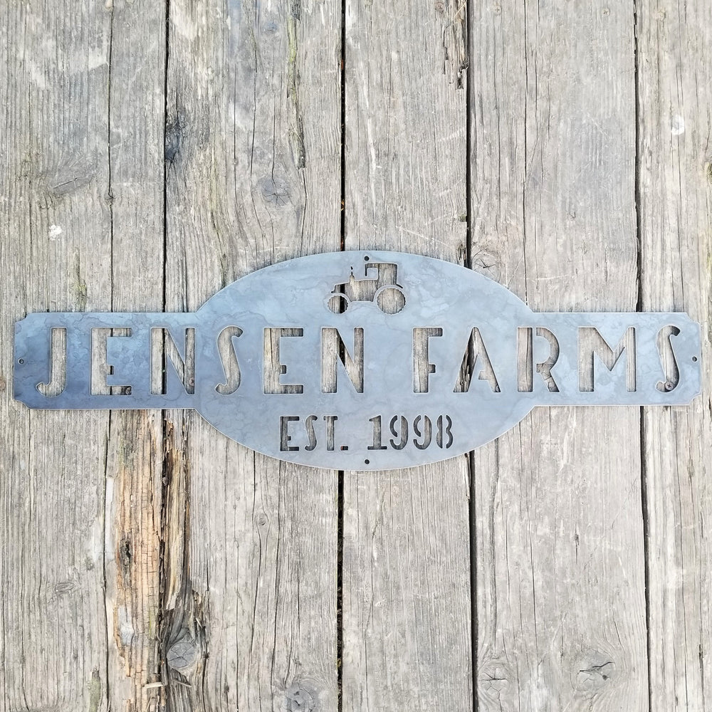 - Customizable: Personalize with your ranch name, family name, or a special message for a unique touch. Choose an image Tractor (1), Cow (2), Tools (3), Chicken (4), Heart (5), Goat (6), your family or property name, and the established date. The MIDDLE line of text can fit up to 11 characters (1-2 words) and "EST." section can be adjusted to any year. Leave a Note to Seller at checkout with the image and text you would like.